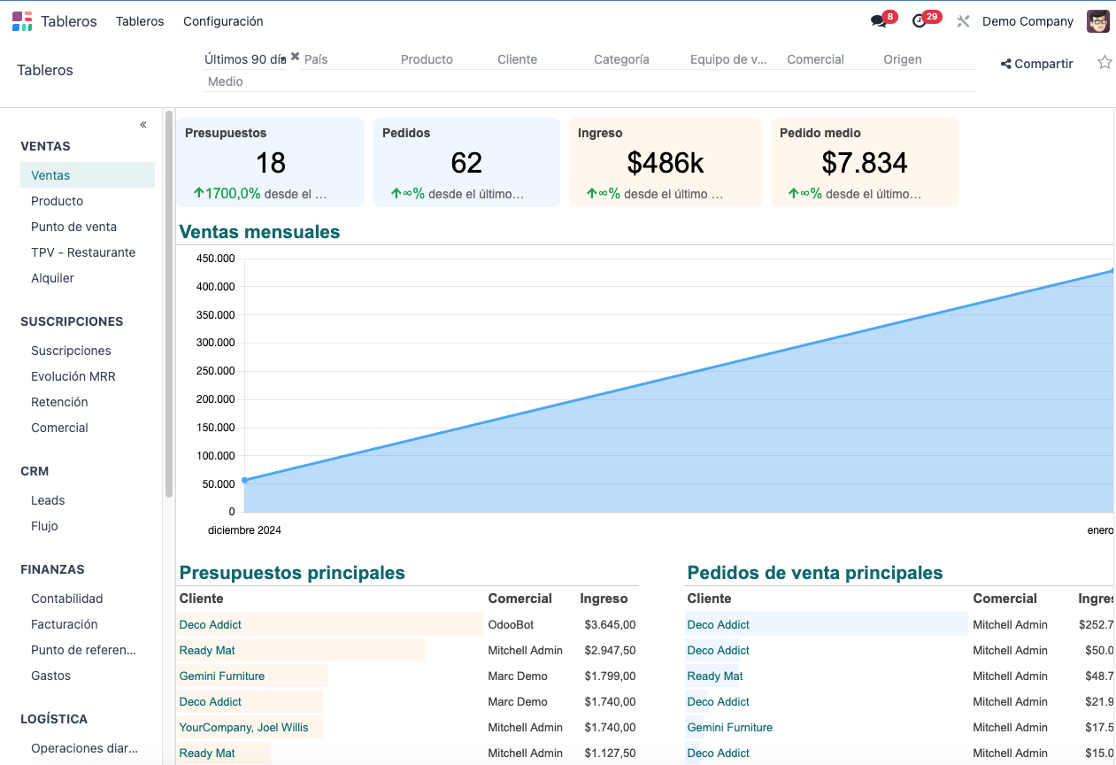 Odoo te ofrece una solución todo en uno para gestionar tu negocio de forma eficiente. Accede a todas las métricas clave con un solo clic y toma decisiones informadas al instante. Desde ventas hasta inventarios, todo centralizado en una plataforma fácil de usar.